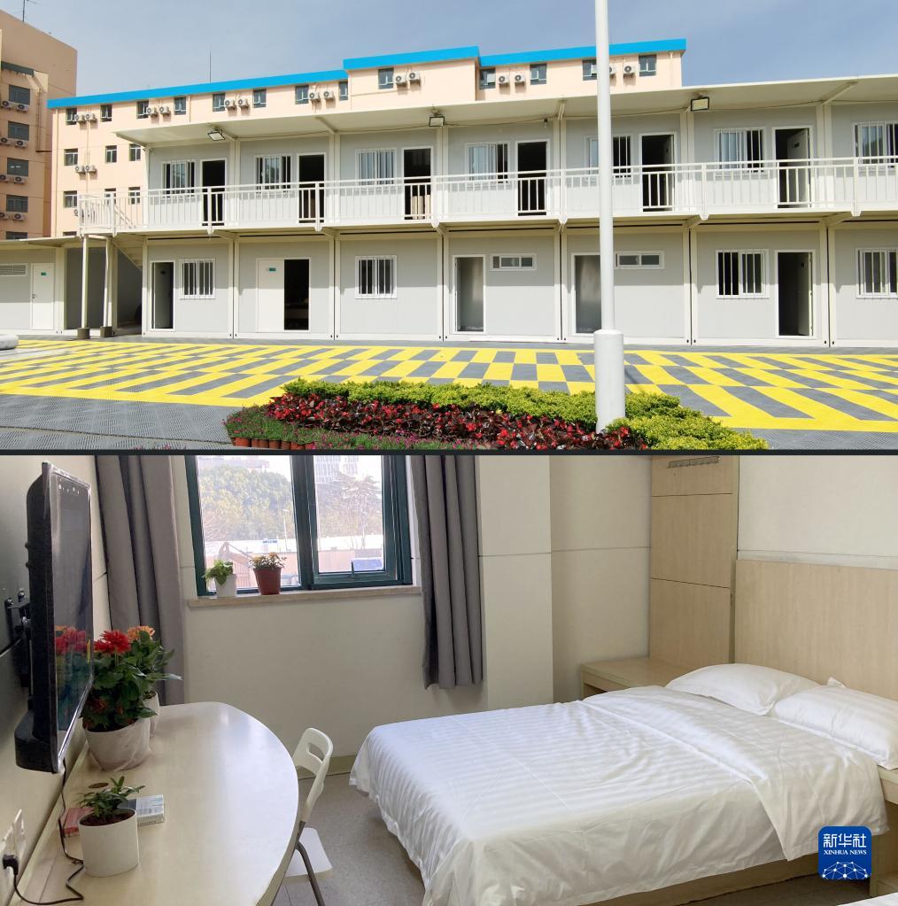 拼版照片:陳娟團隊設計的徐匯區龍耀路方艙的外景(上)與內景(下)(3月16日攝)。新華社發(fā)(受訪(fǎng)者供圖)