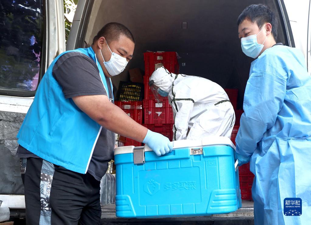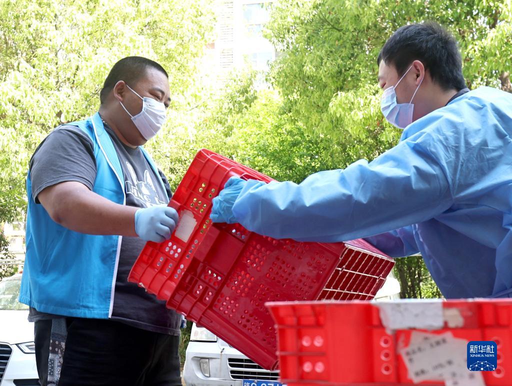 4月17日,李曉?。ㄗ螅┡c志愿者在閔行區虹梅景苑二街坊卸貨。新華社記者 陳建力 攝
