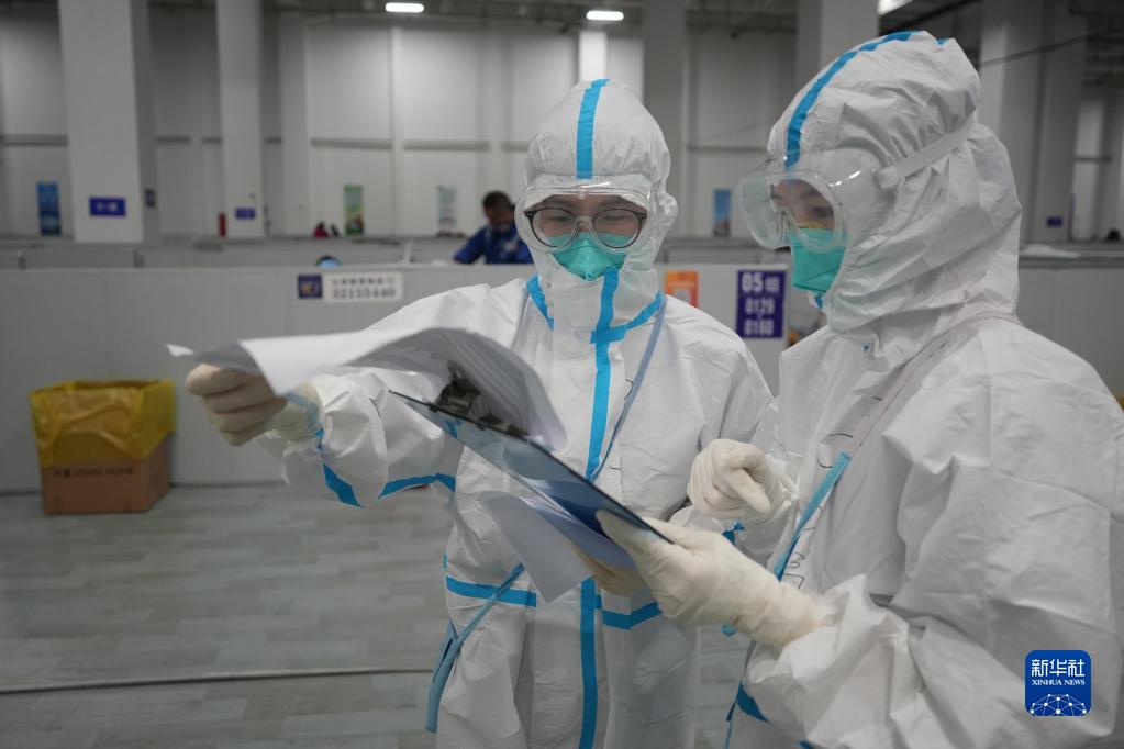 4月16日,醫護人員在上海臨港方艙醫院核對患者住院床位。新華社記者 楊有宗 攝