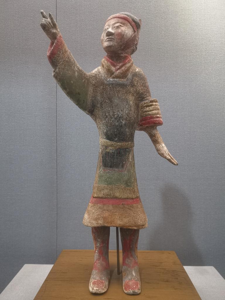 指揮俑、薄書(shū)俑、執旗俑、立射俑……除了數量較多的騎兵俑和步兵俑之外,這批西漢彩繪兵馬俑還有諸多形姿特殊的士兵俑,表明漢代軍隊中設置有儀仗、書(shū)記、指揮等不同職務(wù)?!罢构裰羞@件體量最高的指揮俑應該就是統領(lǐng)二千人以上的將軍?!眳菚澡榻B說(shuō),“這件指揮俑高56厘米,寬30厘米,頭戴武冠,身著(zhù)紅綠彩色戰袍,右手上舉至前額,伸出大拇指和食指做指揮狀,形態(tài)生動(dòng),是非常珍貴的國家一級文物?!?/p>
