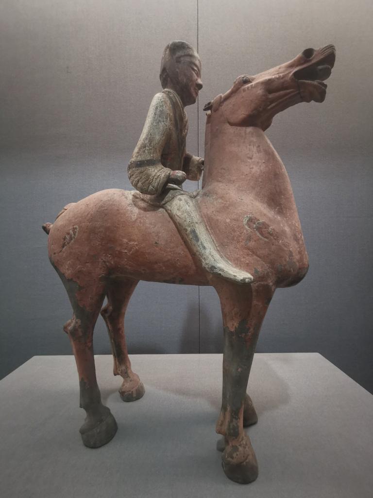 國際古跡遺址日來(lái)臨之際,記者走進(jìn)咸陽(yáng)博物院。在展柜中,這些西漢年間的威武之師,分為步兵軍陣和騎兵方陣,小騎馬俑手執弓弩,背負箭囊;大騎馬俑身著(zhù)鎧甲,手執戰戟。他們身下的戰馬怒目圓瞪,雙耳直豎,鼻子和嘴巴微微張開(kāi),呈現出蓄勢待發(fā)的“一級戰備”狀態(tài)。
