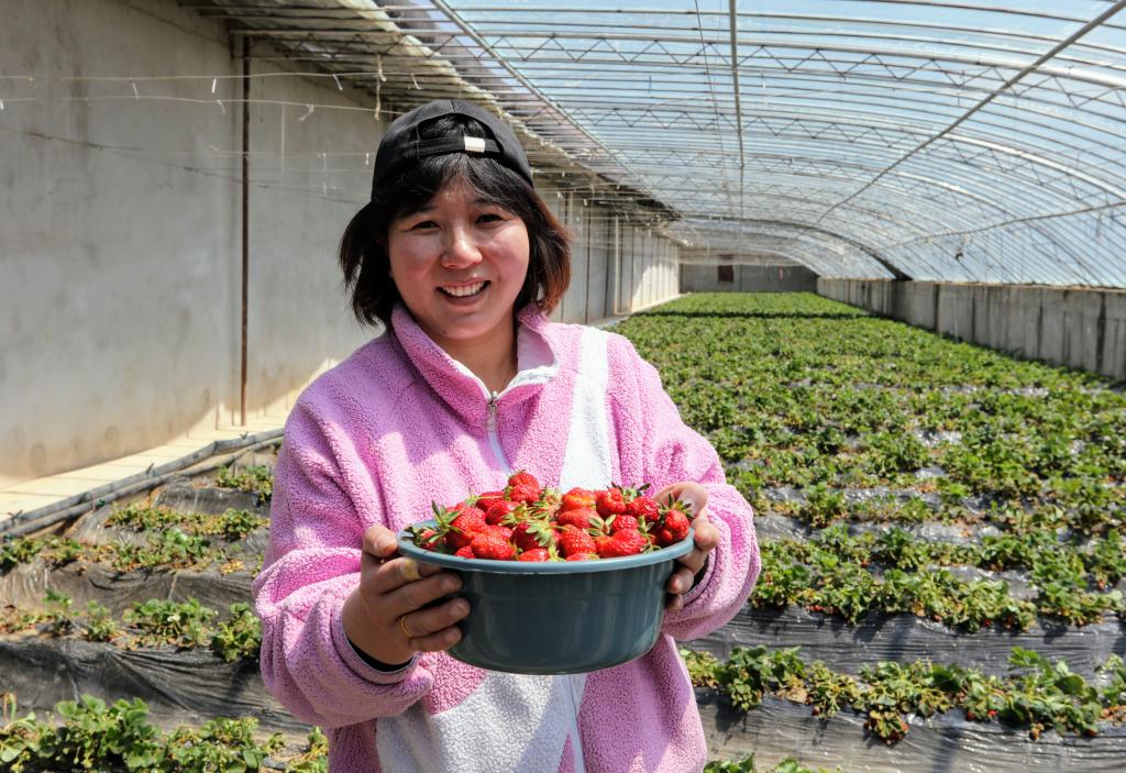 來(lái)自河南的農民楊華麗在西藏阿里地區噶爾縣生態(tài)農業(yè)產(chǎn)業(yè)園展示自己種出的草莓(2022年4月10日攝)。新華社記者 姜帆 攝