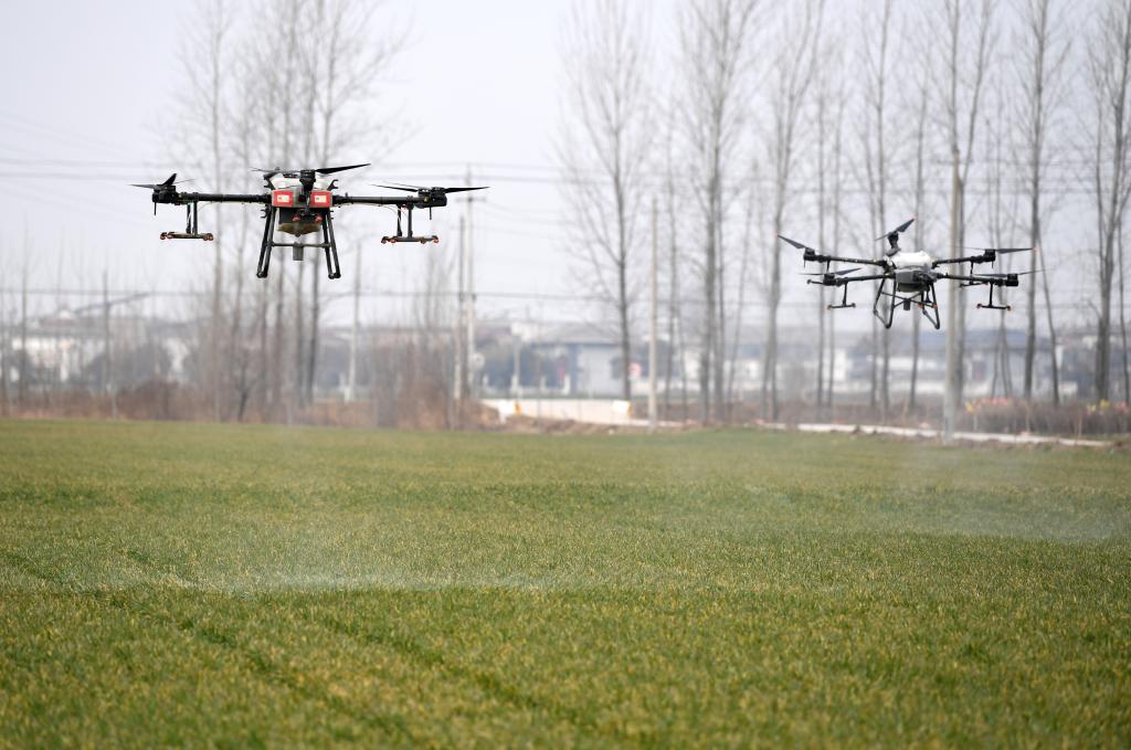 2月11日,無(wú)人機在安徽省亳州市譙城區趙橋鄉“無(wú)人農場(chǎng)”噴灑除草劑。新華社記者 劉軍喜 攝