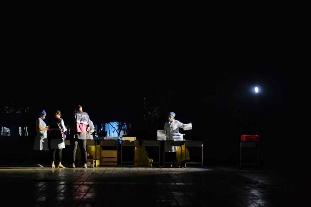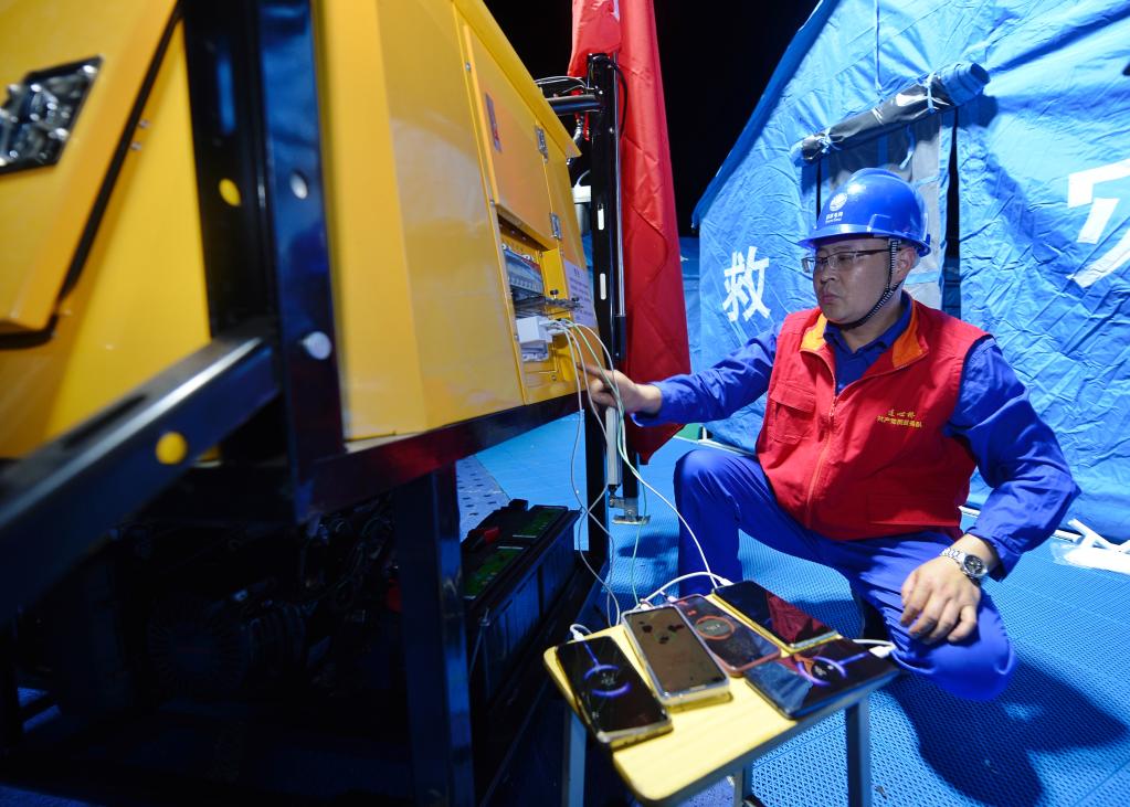 6月1日晚,在四川雅安市蘆山縣太平鎮太平中學(xué)安置點(diǎn)內,國家電網(wǎng)蘆山電力公司工作人員在開(kāi)展應急保電。新華社記者 劉坤 攝
