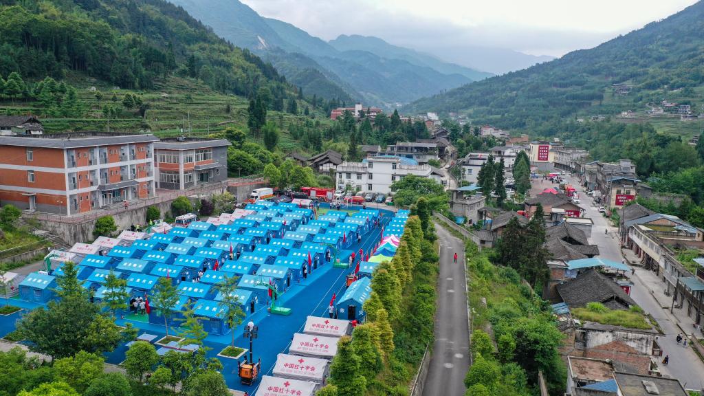 這是6月2日在四川省蘆山縣太平鎮拍攝的太平中學(xué)安置點(diǎn)(無(wú)人機照片)。新華社記者 王曦 攝