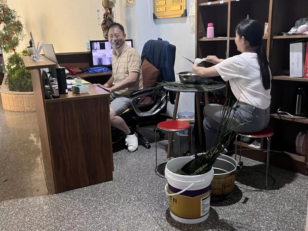 6月2日,蘆山縣城一家賓館老板給入住救援人員包粽子。 新華社記者 盧宥伊 攝