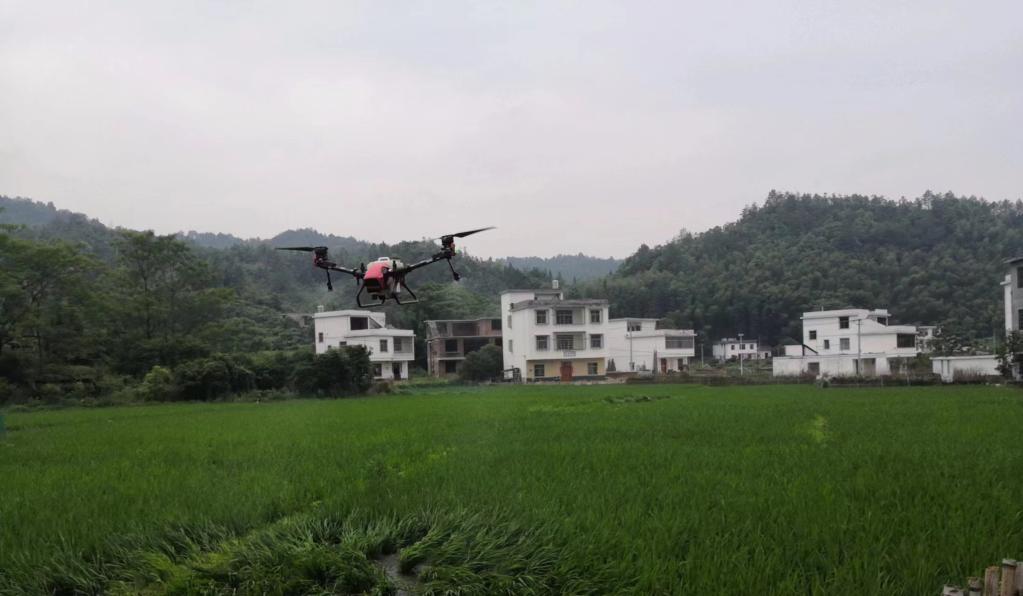 圖為農業(yè)無(wú)人機在上猶縣陡水鎮茶坑村進(jìn)行稻田撒藥作業(yè)。(上猶縣委宣傳部供圖)