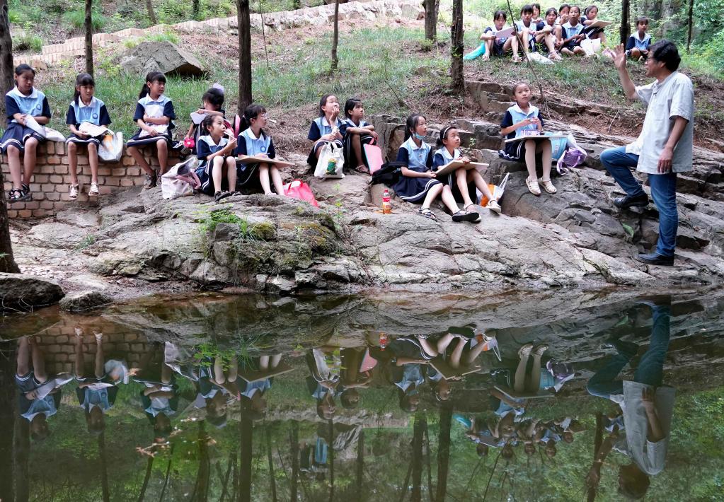 夏日的午后,山谷的靜謐被一群孩子打破。十來(lái)個(gè)八九歲的孩子,背著(zhù)畫(huà)板,三三兩兩跳躍在山間的石磚路上,郭愛(ài)和走在他們中間。