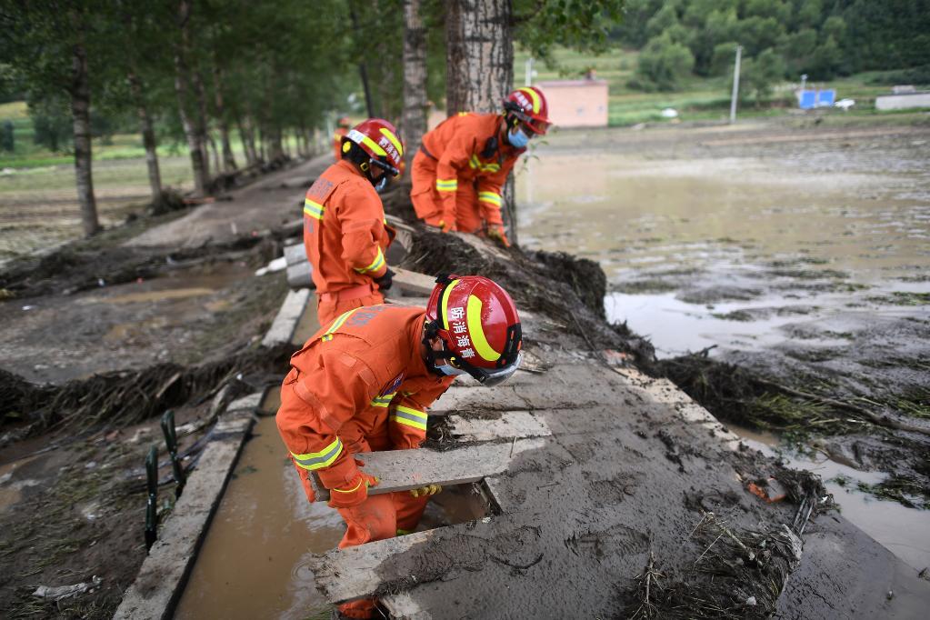 8月18日,青海海東市消防支隊隊員在西寧市大通回族土族自治縣青山鄉賀家莊村開(kāi)展救援工作。新華社記者 張宏祥 攝