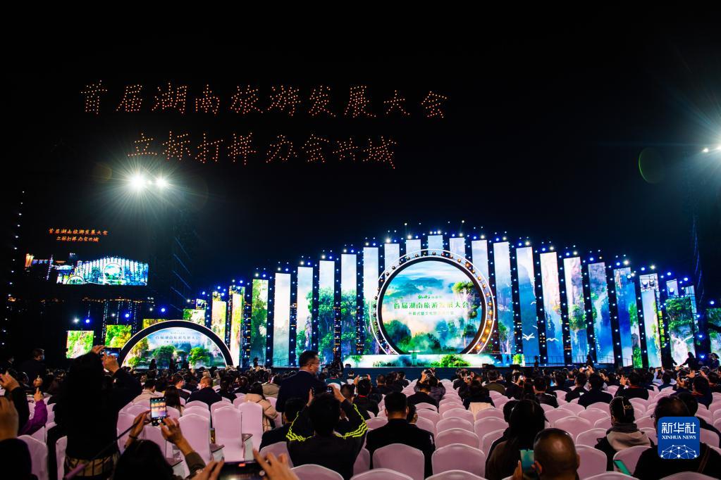 這是11月19日在張家界市民廣場(chǎng)拍攝的首屆湖南旅游發(fā)展大會(huì )開(kāi)幕式現場(chǎng)。新華社記者陳思汗攝