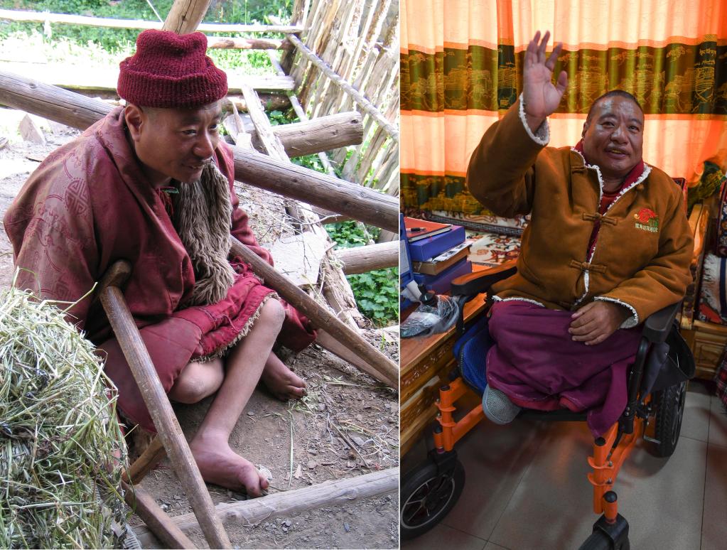 拼版照片:左圖是2004年8月3日在四川省阿壩藏族羌族自治州壤塘縣拍攝的當時(shí)身患嚴重大骨節病的土扎。新華社發(fā)(田剛攝);右圖是在茸木達鄉敬老院,土扎坐在電動(dòng)輪椅上(2022年10月16日攝)。新華社記者王曦 攝