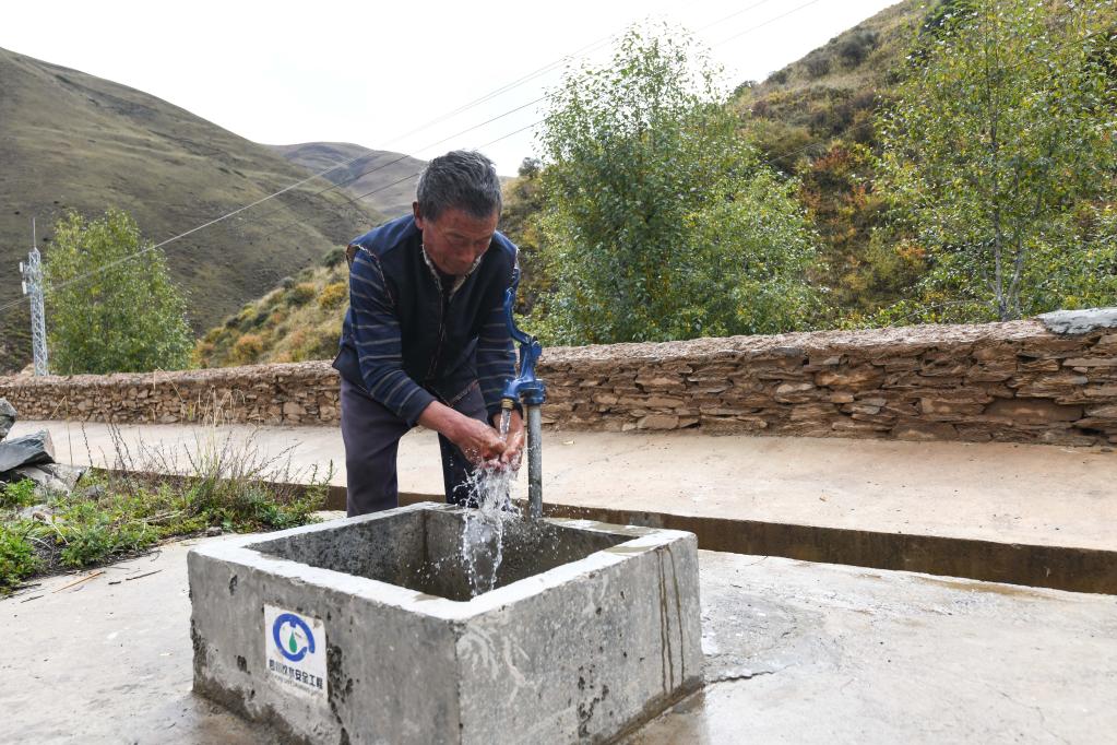 在四川省阿壩藏族羌族自治州壤塘縣茸木達鄉巴爾依村,鐘偉打開(kāi)院子里的自來(lái)水龍頭洗手(2022年10月16日攝)。新華社記者王曦 攝