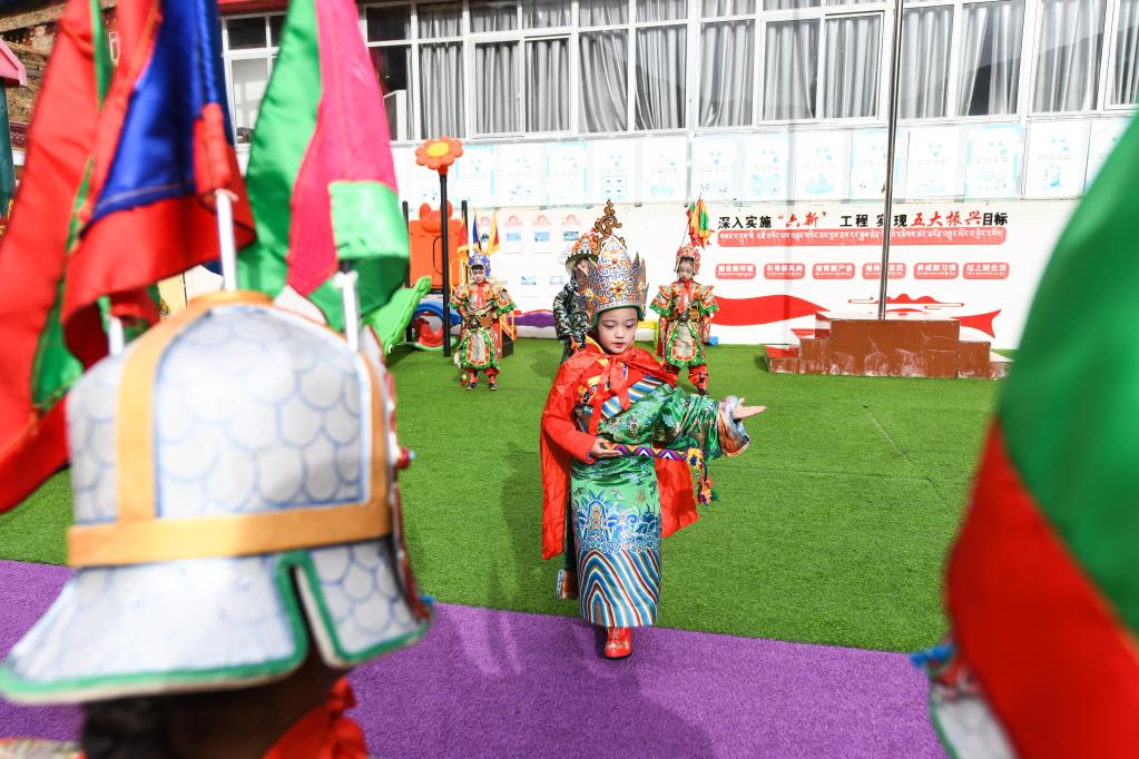 在四川省阿壩藏族羌族自治州壤塘縣茸木達鄉巴爾依村幼兒園,學(xué)生們正在表演藏戲(2022年10月16日攝)。新華社記者王曦 攝