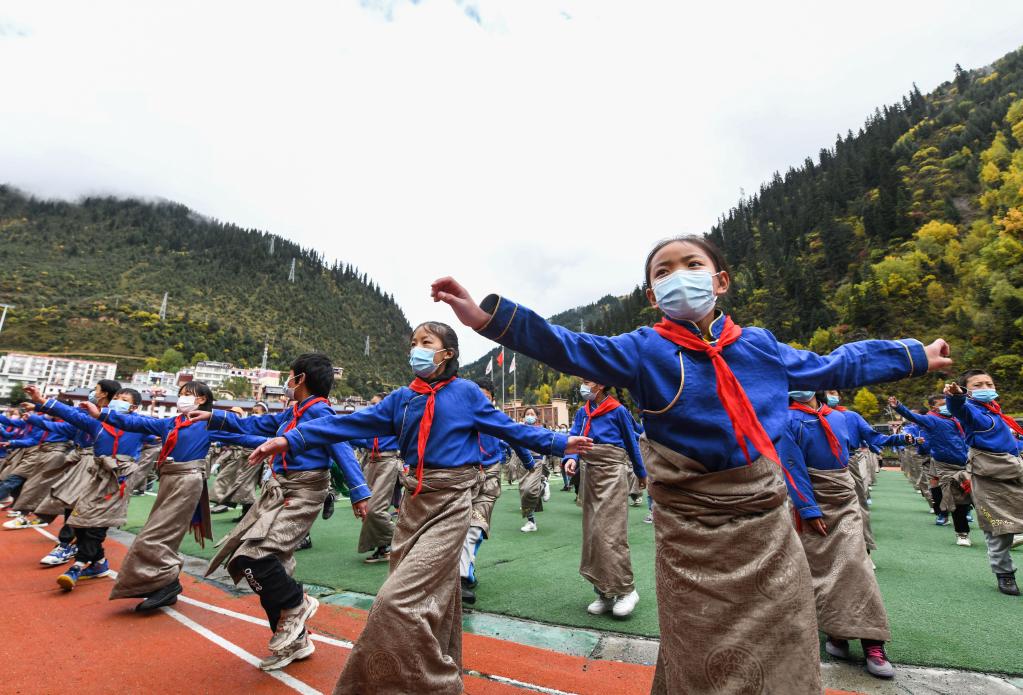 在四川省阿壩藏族羌族自治州壤塘縣寄宿制小學(xué),學(xué)生在操場(chǎng)上做課間操(2022年10月15日攝)。新華社記者王曦 攝