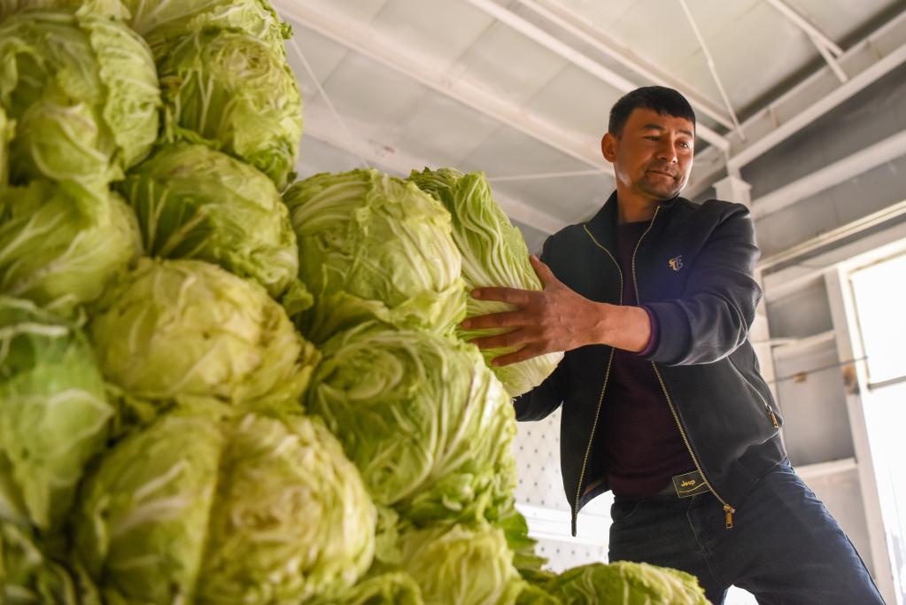在阿克陶縣國投公司分揀中心,員工將大白菜卸車(chē)(3月27日攝)。新華社記者丁磊 攝