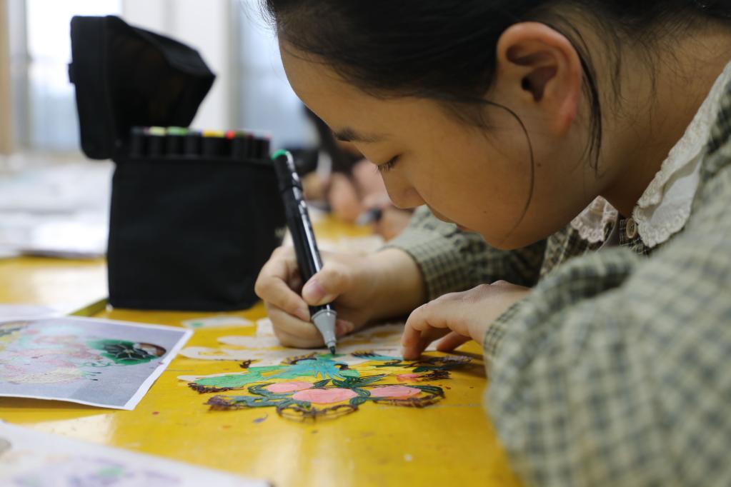 隴東學(xué)院的大學(xué)生正在練習皮影雕刻。新華社記者 張睿 攝