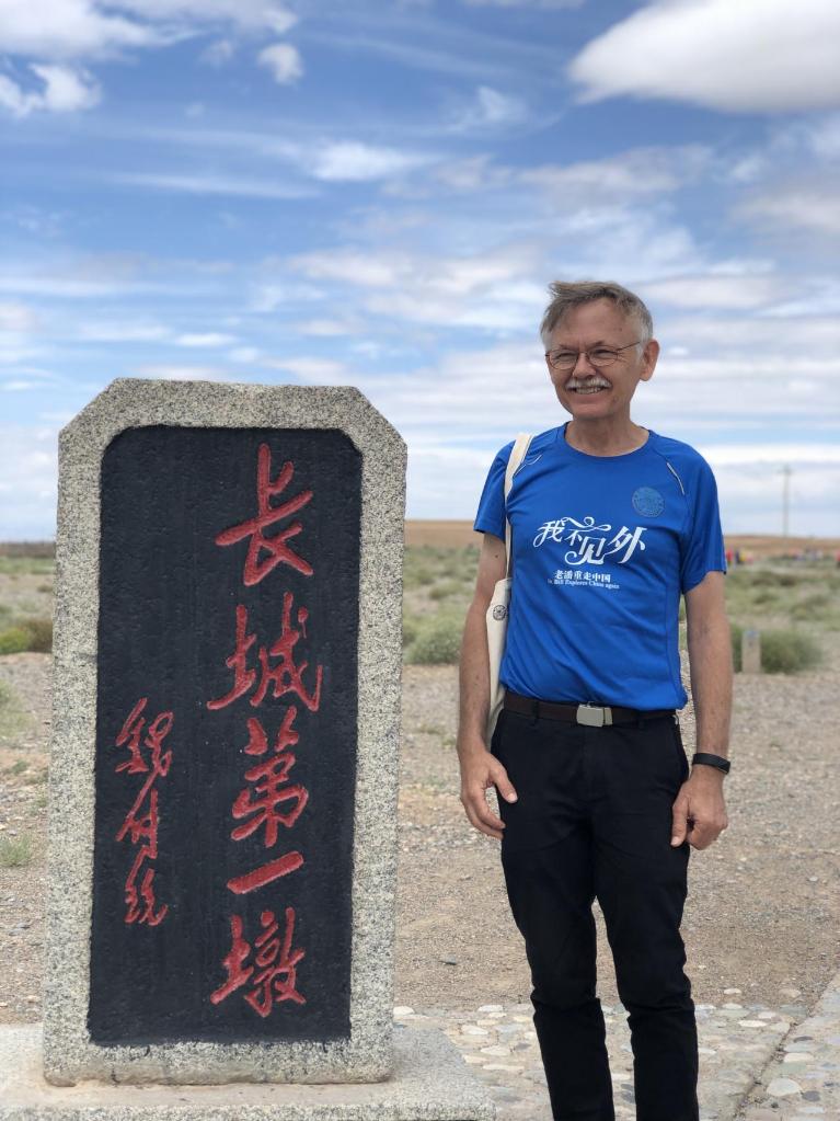 2019年,潘維廉再次環(huán)游中國。圖為潘維廉在嘉峪關(guān)與刻有“長(cháng)城第一墩”的石碑合影。