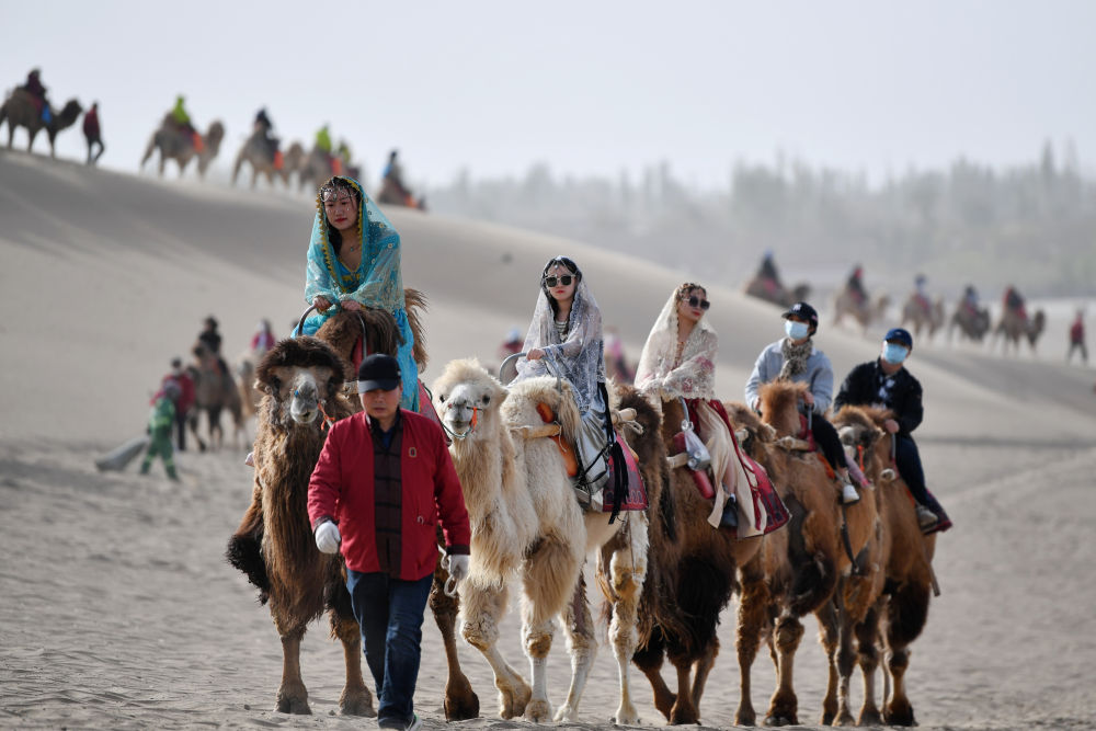 駝隊載著(zhù)游客行走在鳴沙山月牙泉景區的駝道上(2023年4月24日攝)。新華社記者 陳斌 攝