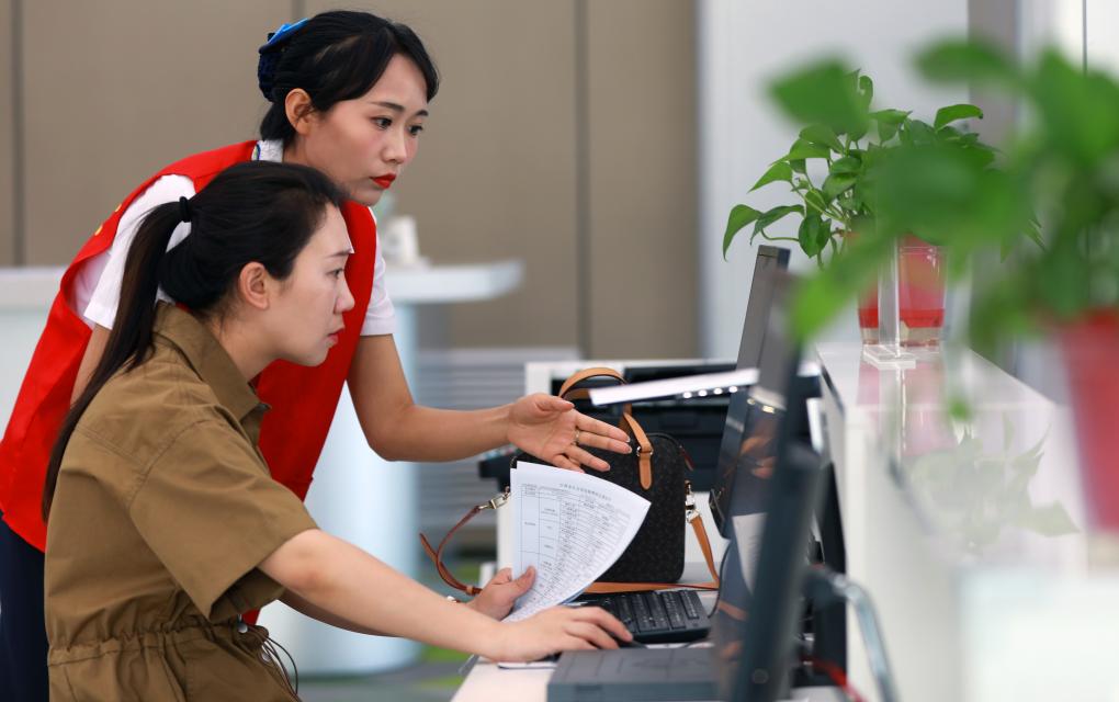 在甘肅省武威市政府政務(wù)服務(wù)中心,志愿者(后)在為市民辦理業(yè)務(wù)提供服務(wù)(2023年6月16日攝)。新華社記者 郭剛 攝