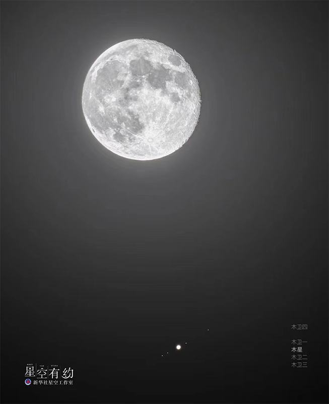 修立鵬提醒,除了用肉眼觀(guān)賞這幕“星月對話(huà)”外,有興趣的公眾如果使用長(cháng)焦鏡頭或是小型天文望遠鏡觀(guān)看,不僅可以拍到月亮與木星“同框”的畫(huà)面,還可以拍到木星兩側的四顆伽利略衛星。