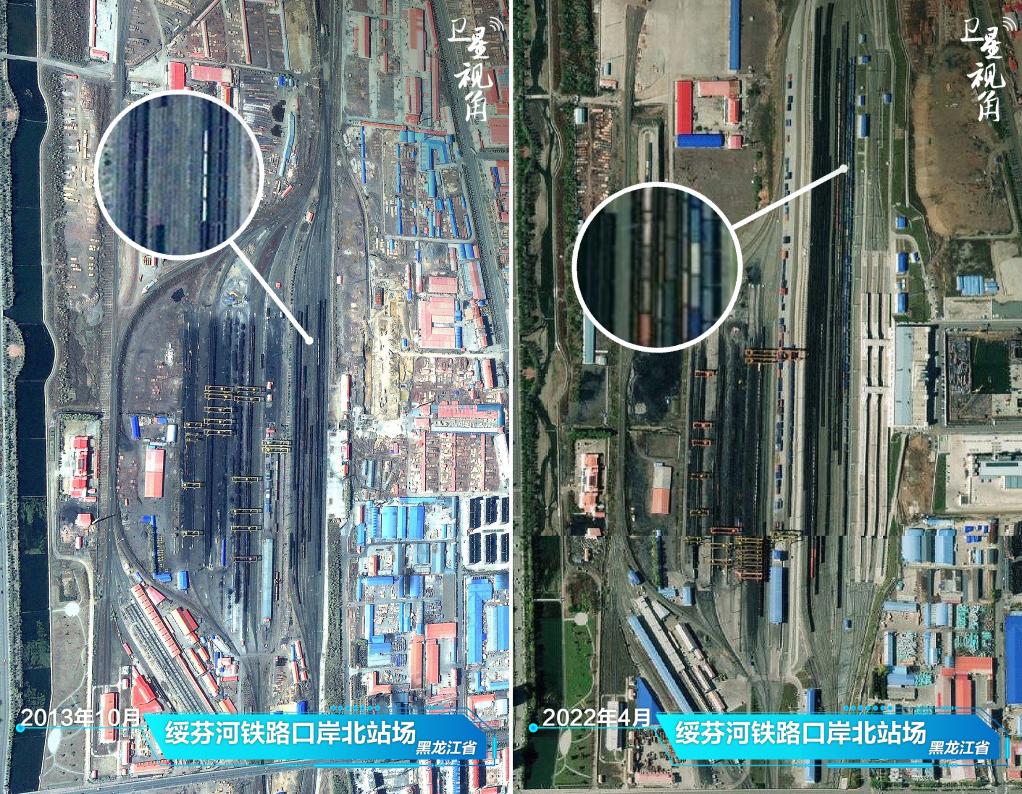 ↑2022年與2013年相比,綏芬河鐵路口岸貨運列車(chē)增多,反映外貿活力增強。