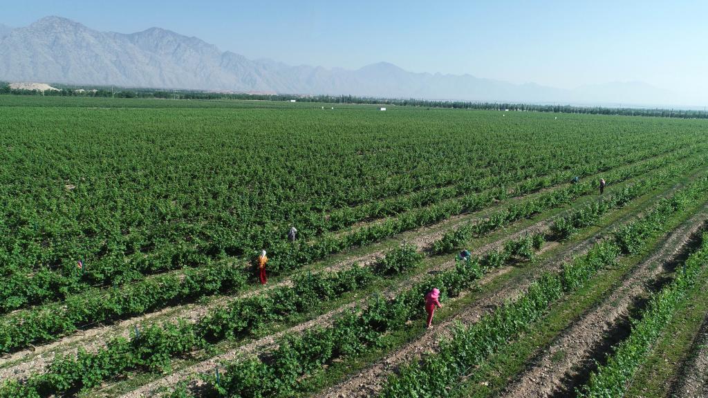 農民在寧夏一座酒莊的葡萄園里采摘葡萄。新華社記者王鵬 攝
