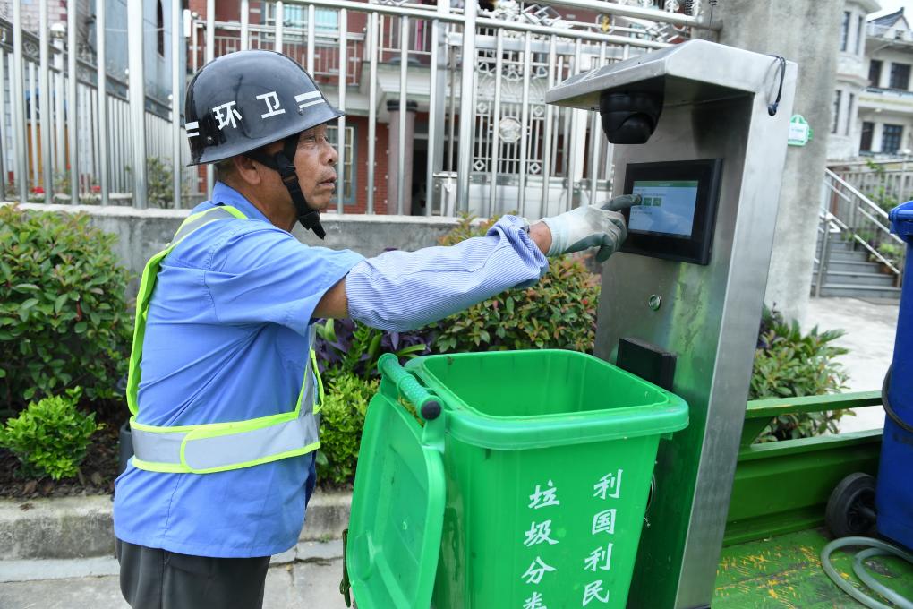 浙江省德清縣乾元鎮易腐垃圾清運員使用垃圾分類(lèi)智能機器。新華社記者林善傳 攝