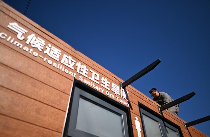 2023年11月1日,在青海省海東市平安區三合鎮幸福家園社區,一名施工人員在社區內安裝環(huán)保廁所。新華社記者 張宏祥 攝