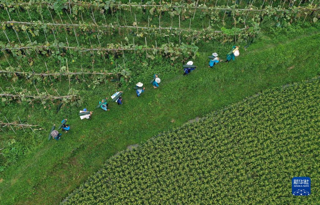 8月23日,村民在貴州省黔東南苗族侗族自治州丹寨縣揚武鎮羊排村冬瓜種植基地采收冬瓜(無(wú)人機照片)。