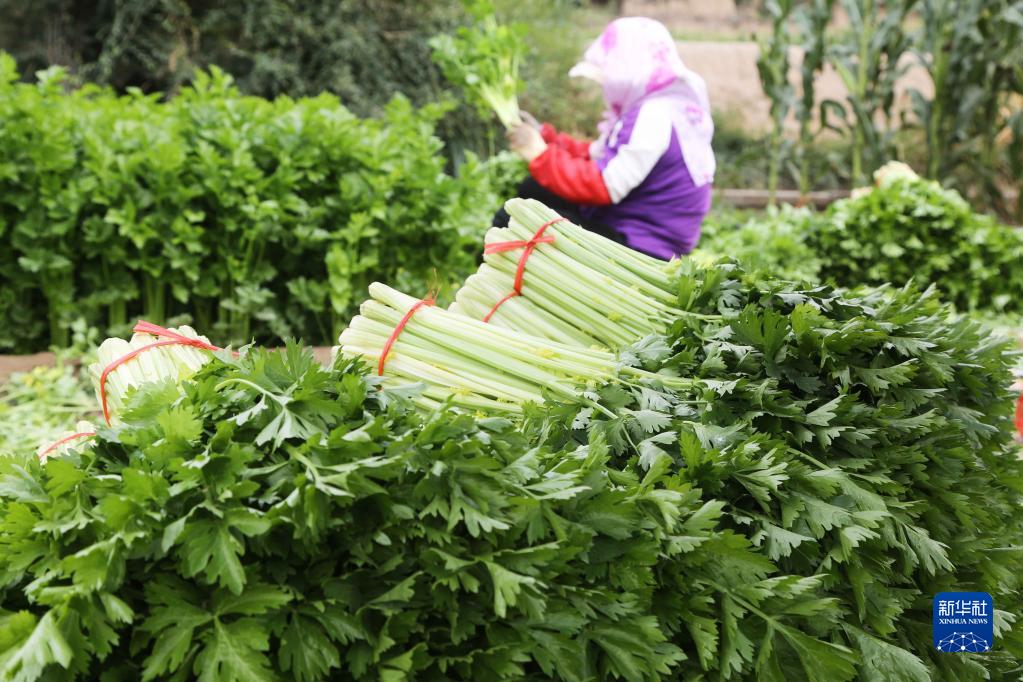 8月23日,甘肅省定西市安定區香泉鎮池溝村的農民在采收芹菜。