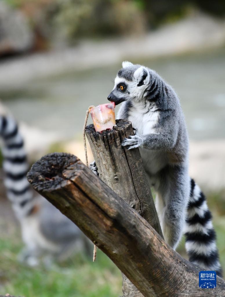 8月26日,一只環(huán)尾狐猴在意大利羅馬動(dòng)物園享用冰凍果蔬。
