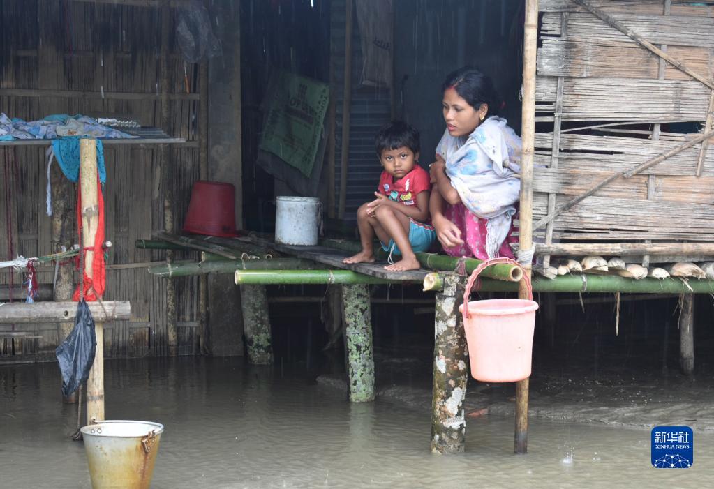 8月28日,在印度阿薩姆邦一個(gè)洪水泛濫的村莊,一名女子和她的女兒坐在高腳屋中。