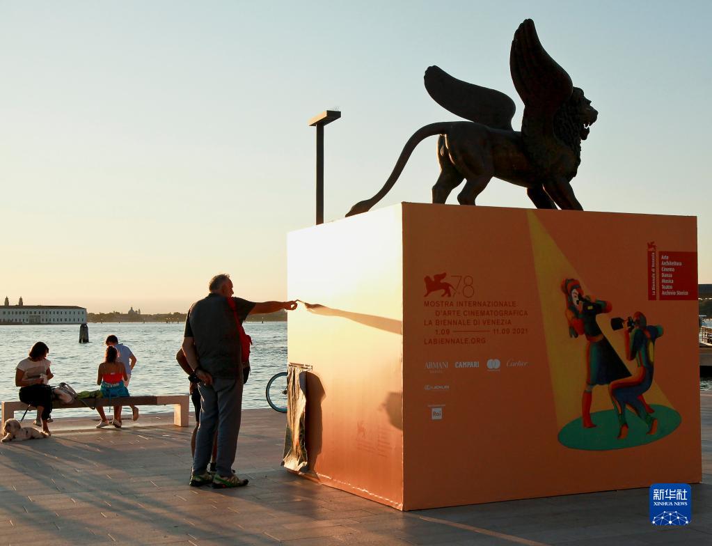 9月1日,在意大利威尼斯利多島,人們閱讀第78屆威尼斯國際電影節的海報。