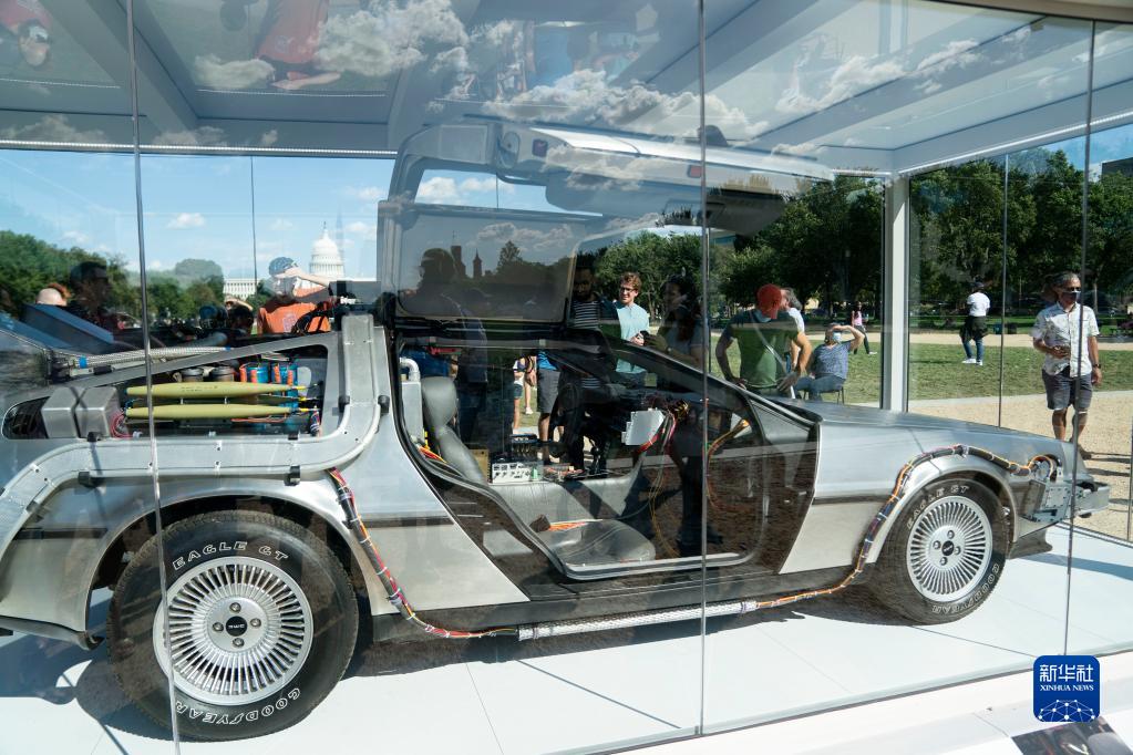 9月6日,人們在美國華盛頓參觀(guān)電影《回到未來(lái)》中的“時(shí)光機”道具汽車(chē)。