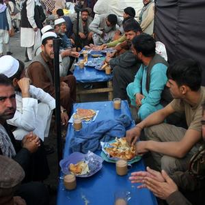 9月15日,阿富汗民眾在喀布爾街頭吃早餐。