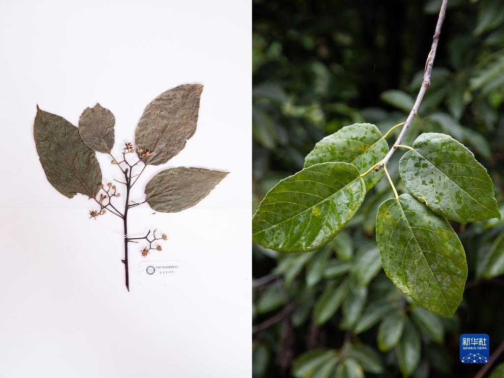 這是10月10日在昆明植物園拍攝的滇桐。這張拼版照片分別為科研人員野外采集的標本(左)和在植物園遷地保護后存活下來(lái)的同種植物。