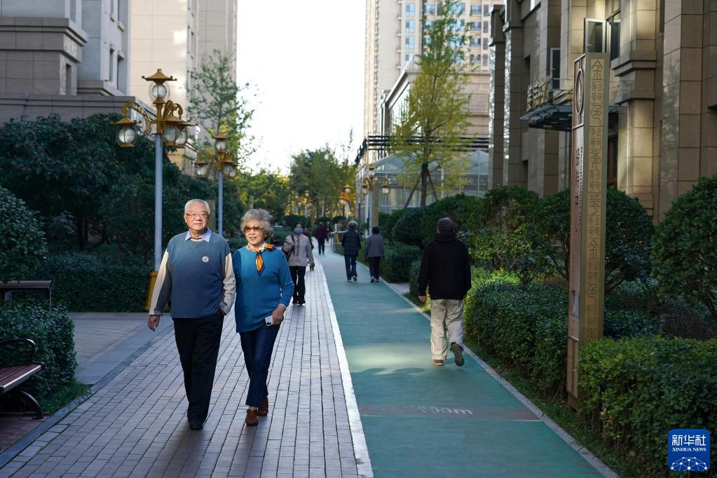 10月11日,在位于河北燕郊的燕達金色年華健康養護中心,呂偉業(yè)(左)和李戰平在散步。