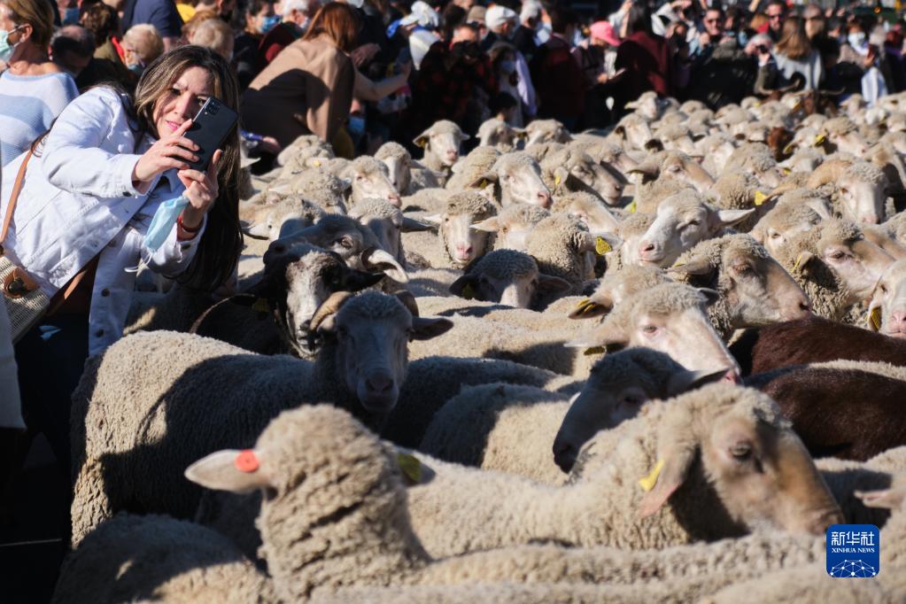 10月24日,一名女子與走過(guò)西班牙馬德里市中心的羊群合影。