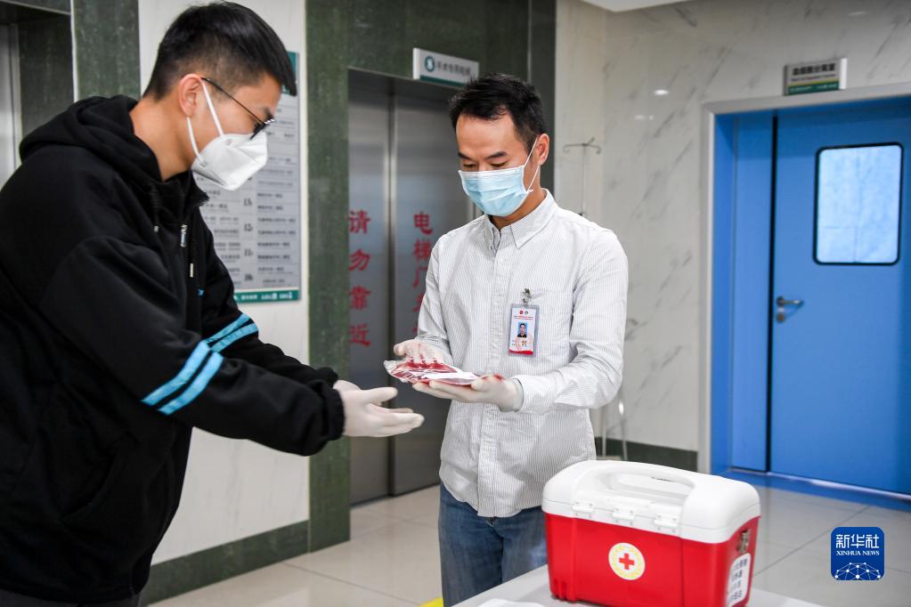 在廣西醫科大學(xué)第一附屬醫院,工作人員將采集好的造血干細胞裝箱,隨后將乘坐飛機將其轉運至受捐者所在的醫院(2021年11月攝)。