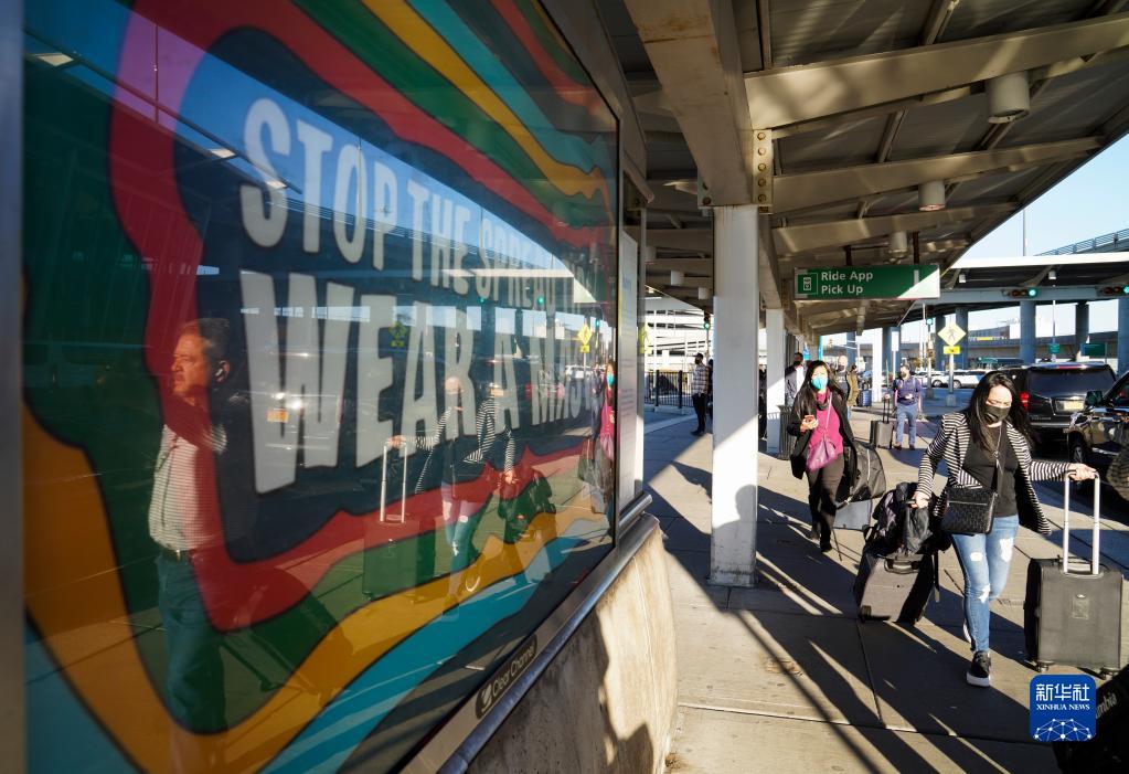 11月8日,在美國紐約肯尼迪國際機場(chǎng),旅客從寫(xiě)著(zhù)“戴上口罩 阻斷傳播”的廣告牌旁走過(guò)。
