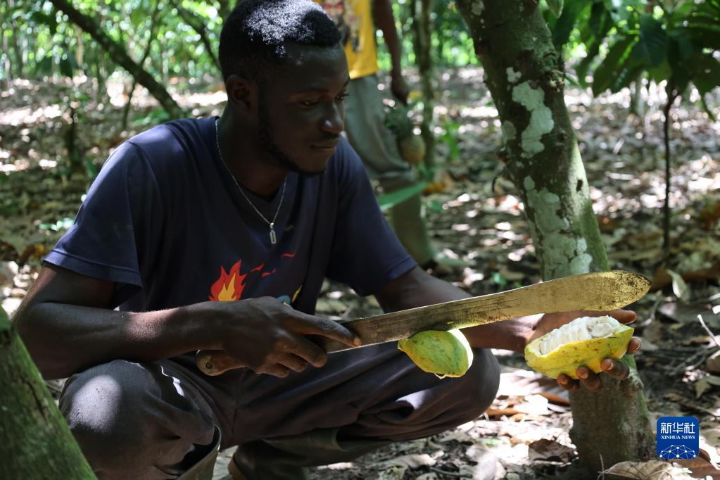 11月15日,在加納東部省的一處可可種植園,一名種植戶(hù)在切割可可果實(shí)。