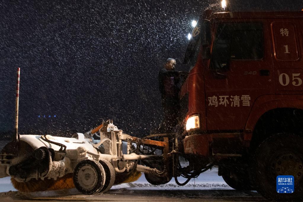 11月21日晚,清雪車(chē)司機在雞西市雞冠區雞東新路上對車(chē)輛進(jìn)行清理。