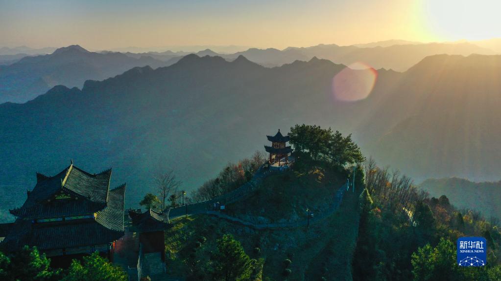 11月23日,朝霞映照著(zhù)廟山寨景區(無(wú)人機照片)。