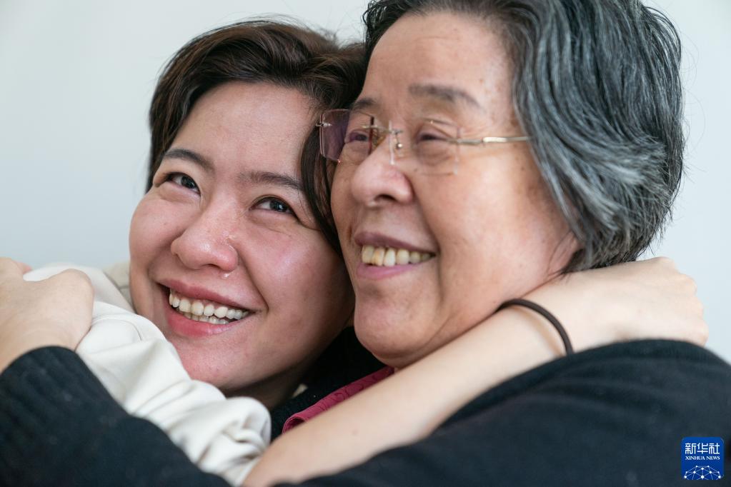 11月24日,女兒吳姝(左)在北京的住所內抱著(zhù)剛剛出院的媽媽?zhuān)樕蠏熘?zhù)幸福的淚水。
