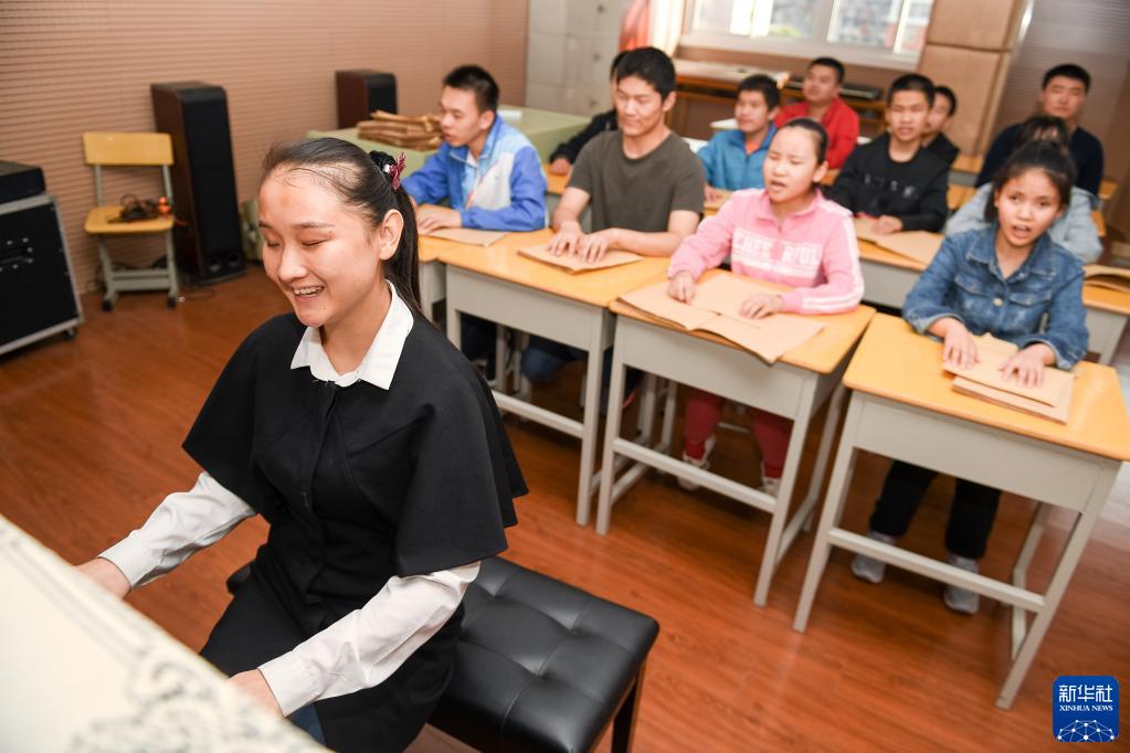 在安慶市特殊教育學(xué)校音樂(lè )教室里,張晨給盲生們上音樂(lè )課(2018年10月10日攝)。