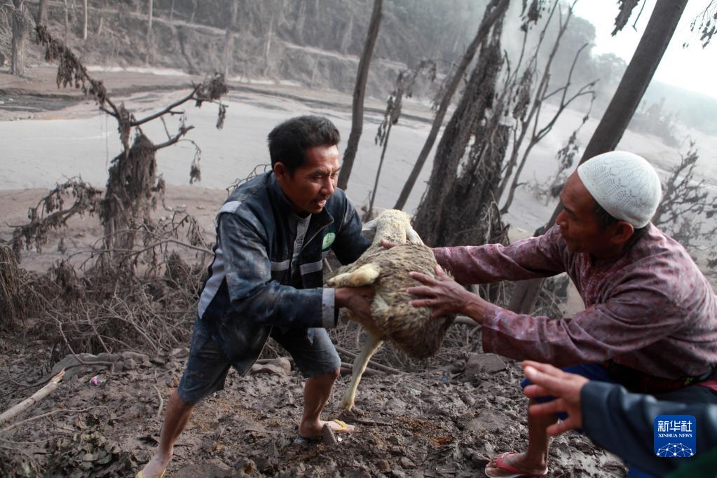 12月5日,在印度尼西亞爪哇島東部盧馬姜,人們在火山噴發(fā)后營(yíng)救綿羊。