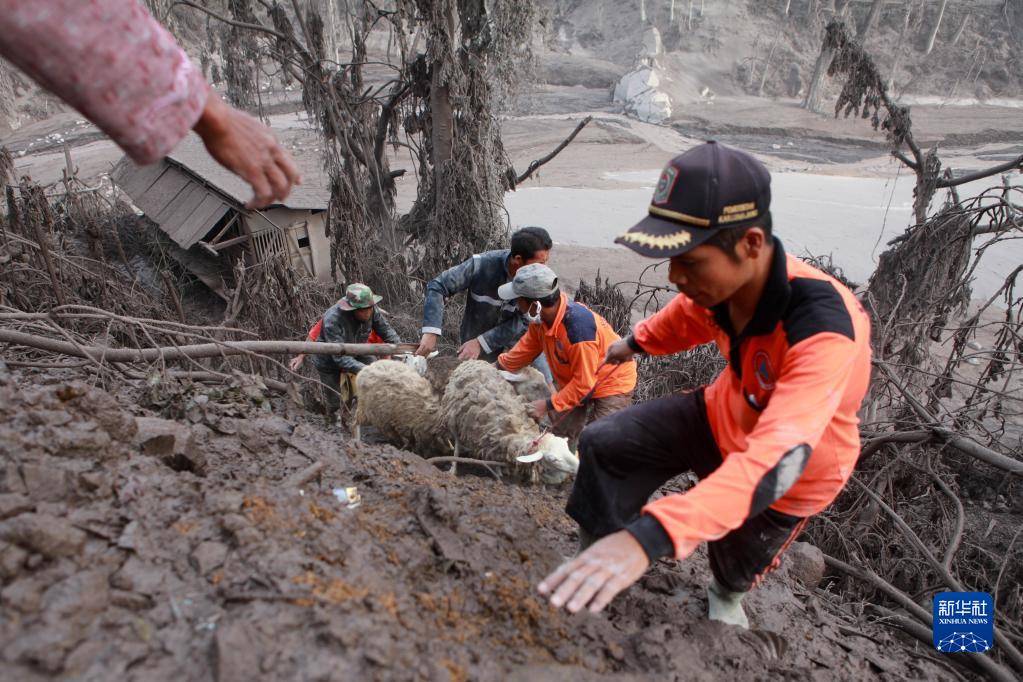12月5日,在印度尼西亞爪哇島東部盧馬姜,人們在火山噴發(fā)后營(yíng)救綿羊。