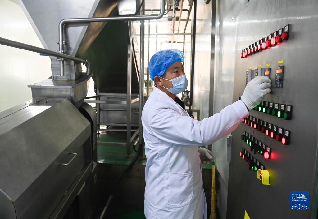 12月2日,在山西省嵐縣界河口鎮,合作社成員在操作榨沙棘汁的機器。新華社記者 柴婷 攝