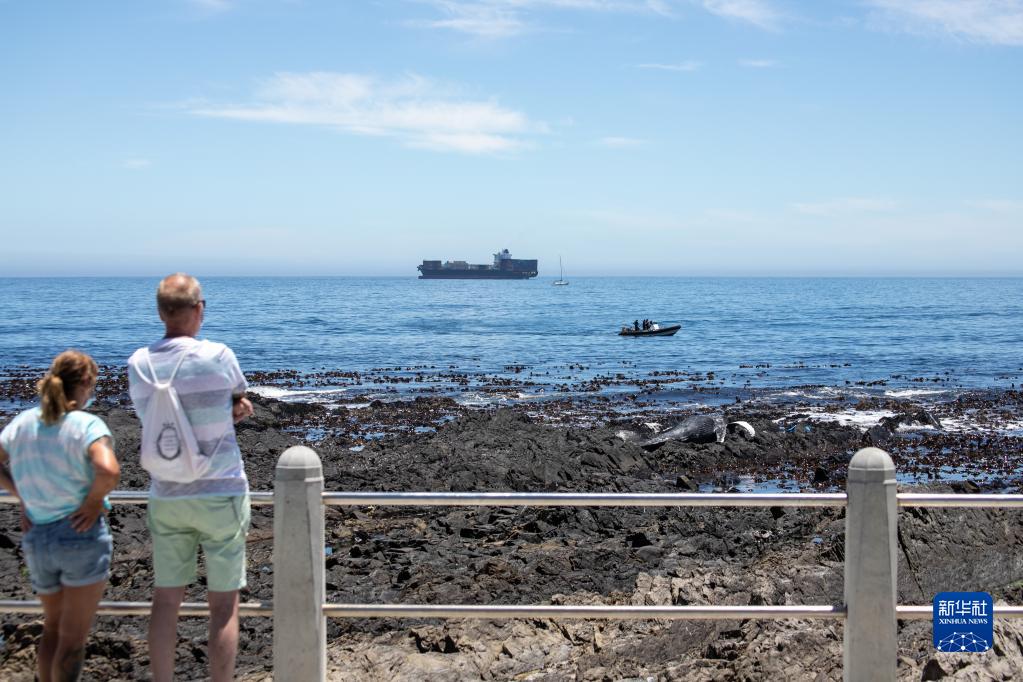 12月9日,人們在南非開(kāi)普敦的海岸邊觀(guān)看工作人員搬運座頭鯨尸體。