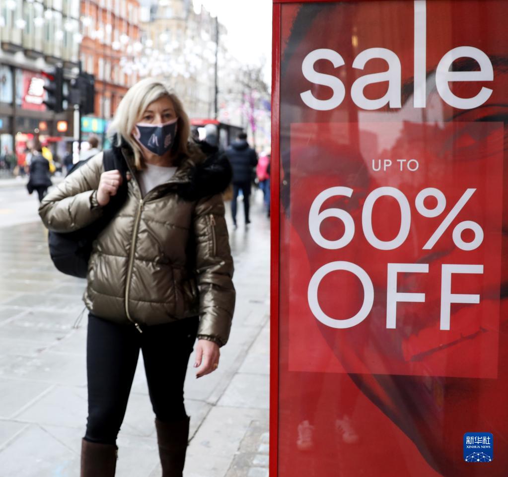 12月26日,一名女子經(jīng)過(guò)英國倫敦牛津街上的一家打折商店。